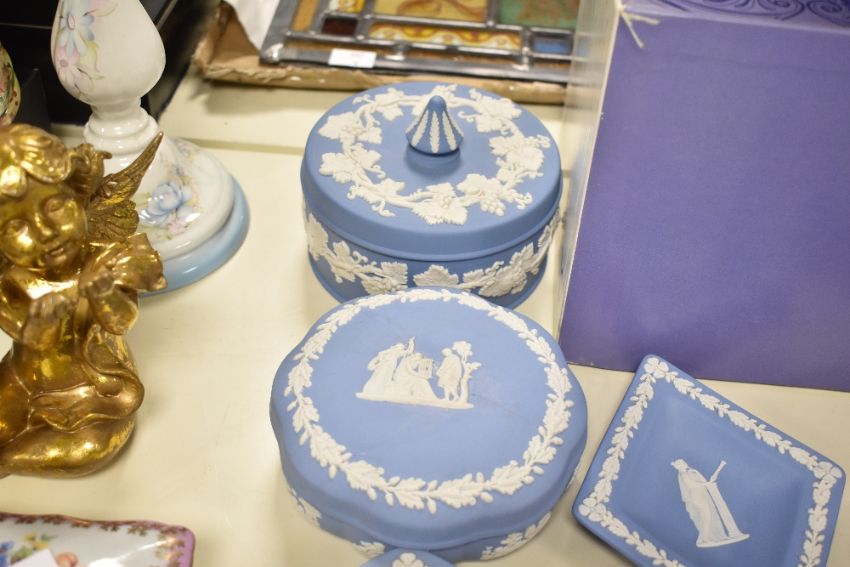 A selection of 20th-century Wedgwood Blue Jasperware, to include a quantity of pin dishes/jewellery trays of varying shapes; two larger lidded jewellery boxes; a teapot; bud vases and more, all marked to base, (approximately 21 pieces), condition is consistent with age and use, some visible areas of surface wear but no visible chips, cracks or fixed damage, sold as seen.