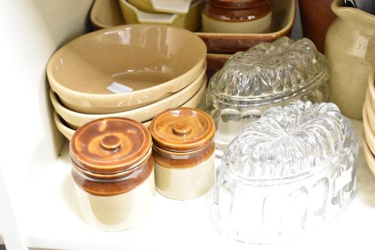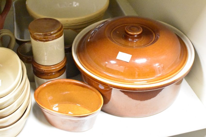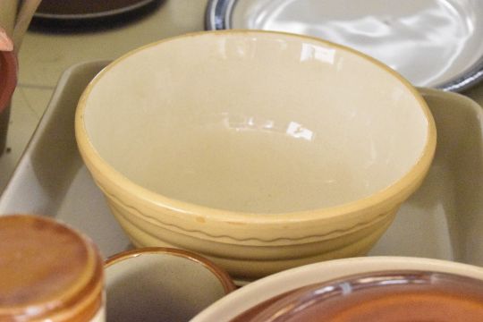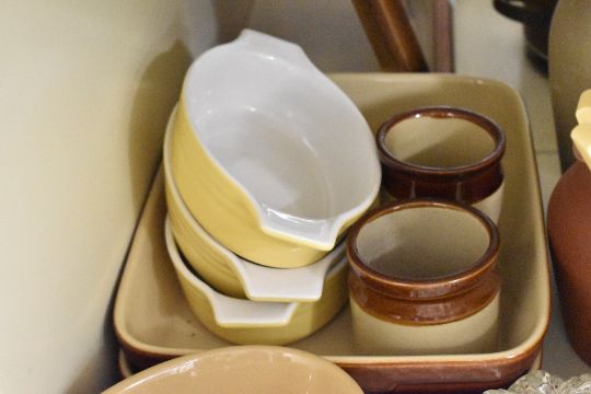A large quantity of late 20th-century stoneware pottery, of soft yellows and neutral colouring, to include Mason Cash Cane Oval Bakers of varying sizes; three large baking dishes; a large lidded tureen; a small selection of Moira Pottery lidded jars; a set of three soft yellow Pyrex-style oval casserole dishes; five Francis Greaves and Sons of Radford Works Sheffield table knives and more, some marked but not all, (approximately 37 pieces), condition is consistent with age and use.
