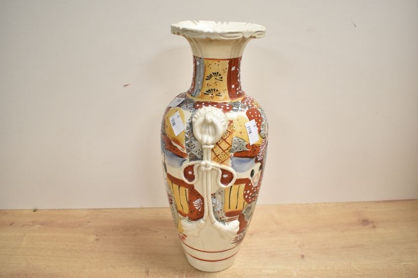 A 20th-century Japanese Satsuma ware vase, of baluster form, featuring an elaborate hand-painted design of traditionally dressed figures, with moulded rope-formed handles, marked to base, 33cm, condition is consistent with age and use, no visible cracks, chips or repairs.