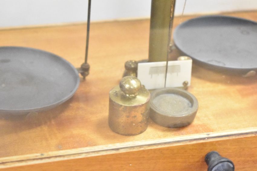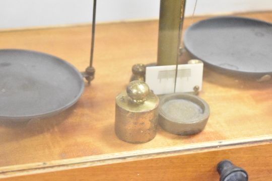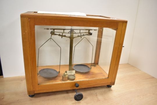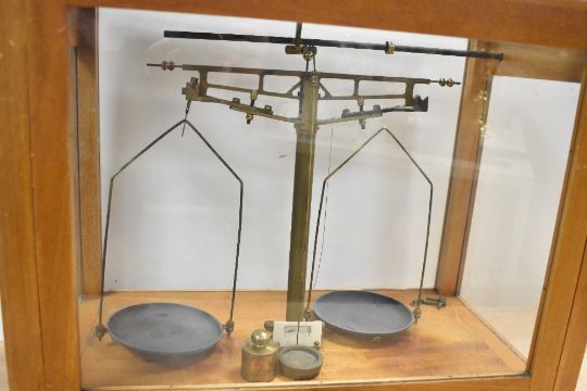 A 20th-century brass Chemical Balance, housed in a wooden and glass case, 46cm.