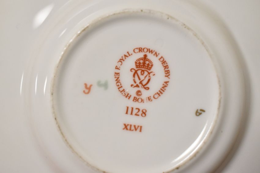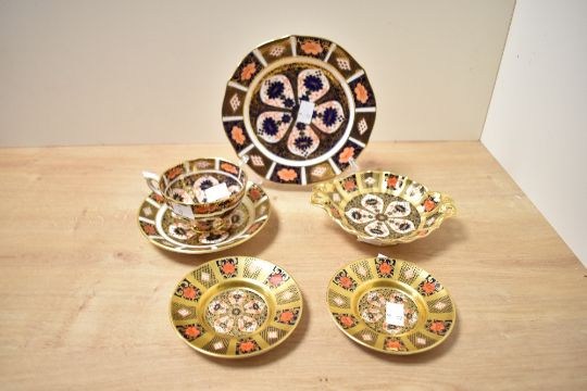 A quantity of 20th-century Royal Crown Derby bone china 'Old Imari' (1128 pattern) ware, featuring blue, iron red and gold embellishments with gilded detailing, to include a cup and saucer, two small plates, one plate, and one Duchess tray, all marked to base, (6 pieces), condition is consistent with age and use, no visible chips, cracks or fixed damage, with some areas of surface wear or slight gilding wear.