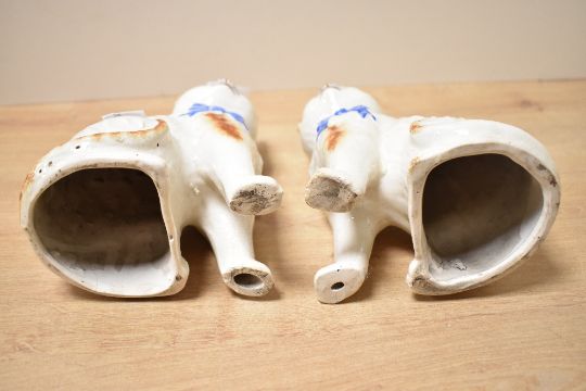 Two sweet 19th-century Staffordshire pottery mantel cat figurines, featuring hand-painted royal blue bows with cream and rusted orange 'fur' coats, unmarked, 21.5cm tall, condition is consistent with age and use, visible areas of surface wear, one has some glaze wear whilst the other has a small chip to its left ear.