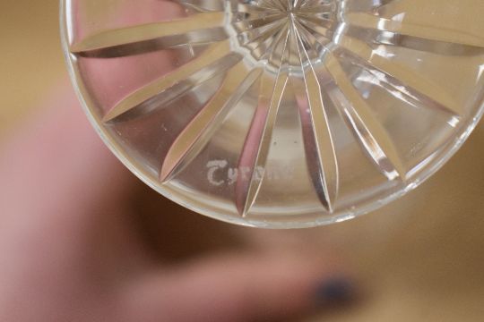 Six 20th-century Irish Tyrone Crafted Glass 'Antrim' wine glasses, featuring deep diamond and vertical wedge cuts to the bowl and a starburst pattern to the base, etched to base, all 16.5cm tall, condition consistent with age and use, no visible chips, cracks or restoration.