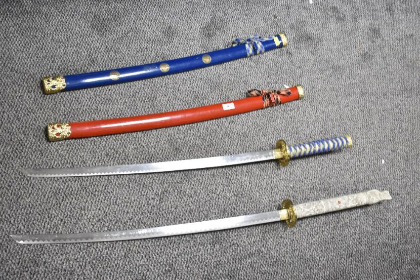 Two 20th-century reproduction decorative Japanese-style swords, unmarked, (2), condition is consistent with age and use, visible wear to scabbards.