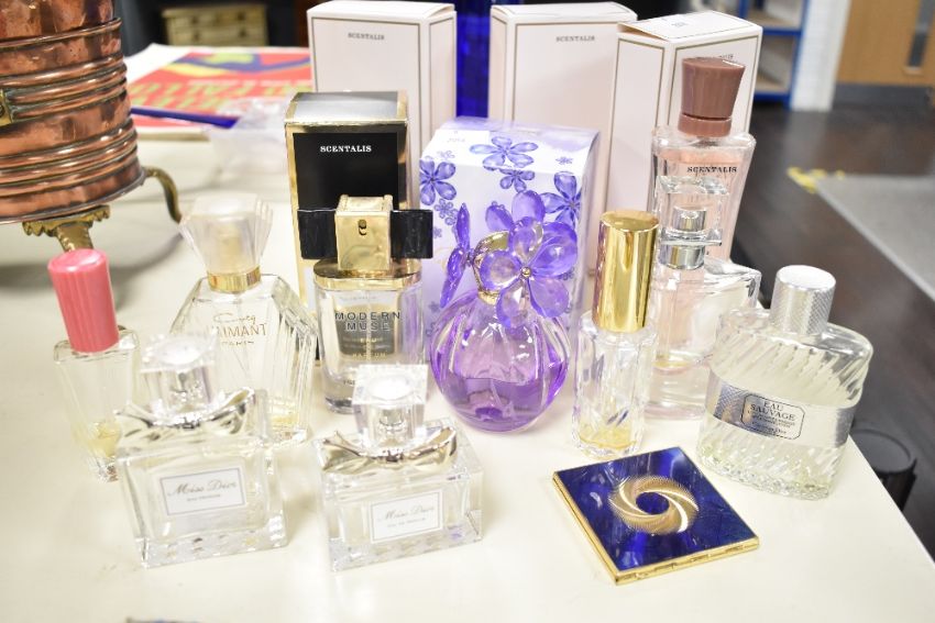 A quantity of 20th-century Vanity wares, to include a quantity of perfumes and bottles; a selection of Innoxa Paris Mist bath cubes; lipstick-shaped atomisers and more; sold with an Art Nouveau-style repousse leather hand mirror, featuring cherub decoration, (1 hand mirror, 5 bath cubes, 18 perfumes), condition is consistent with age and use, some of perfume bottles are empty, sold as seen.