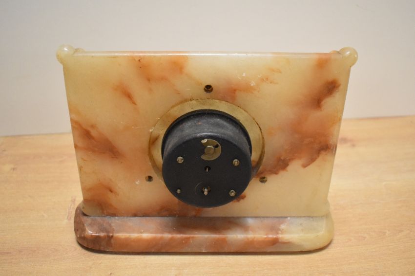 Thought to be early 20th-century Art Deco-style hard stone mantel clock, featuring geometric elements with carved orb-forms to the corners, upon a smooth base, featuring a stylised brass face of Arabic hours, unmarked, 25cm x 20cm, condition is consistent with age and use, visible wear to hard stone around base, sold as seen.