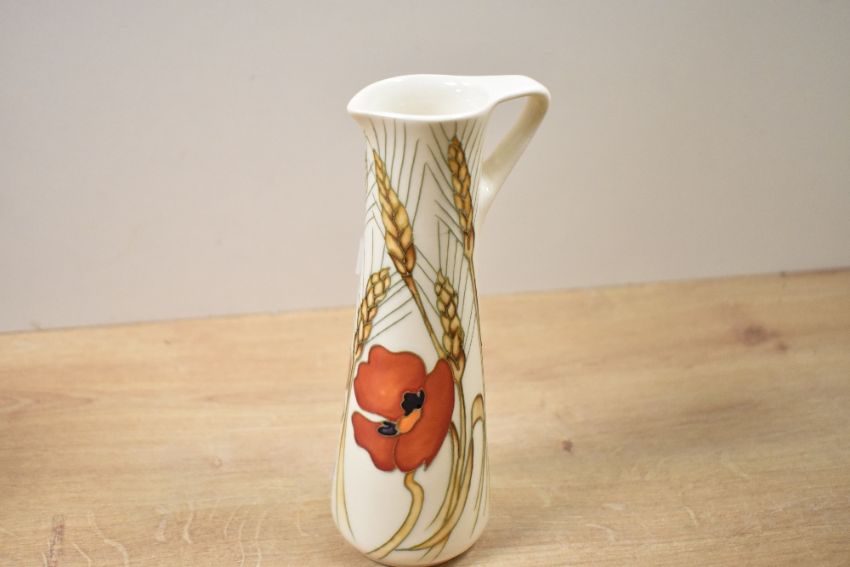 A small 20th-century Moorcroft Pottery 'Harvest Poppy' jug, designed by Emma Bossons, featuring tube-lined red poppies and wheat ears against a cream-coloured background, marked and impressed to base, 18.5cm, condition is consistent with age and use.