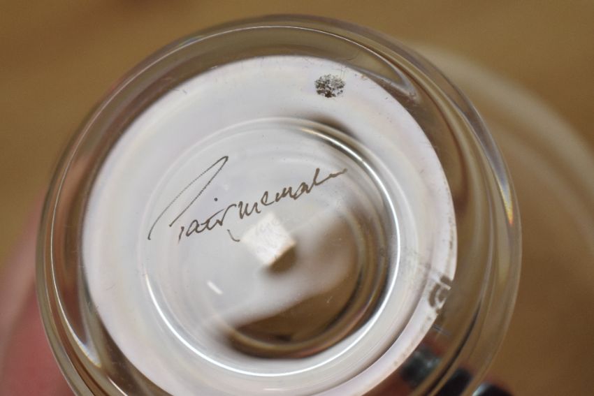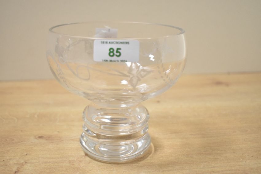 A 20th-century Dartington Crystal glass bowl, featuring hand engraved vine and foliate decoration, etched to base, 12cm tall and 13cm diameter, condition is consistent with age and use, no visible chips, cracks or fixed damage.
