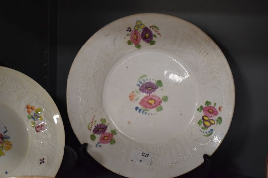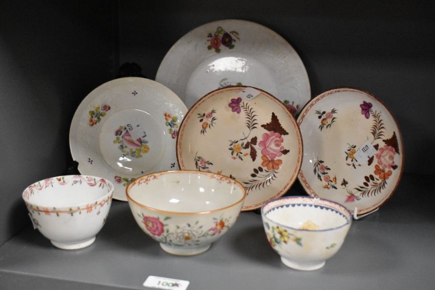A quantity of 18th to 19th hand painted porcelain, to include two Staffordshire 'Minton Pattern No. 72' plates, featuring floral and foliate decoration; a Spode Copeland-style plate; a Newell Pottery tea bowl, having delicate floral decoration and others, unmarked, (7), condition is consistent with age and use, no visible chips or cracks but visible surface wear.