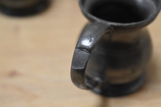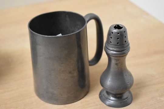 A small quantity of late 19th to early 20th-century pewterware, to include three tankards of graduating sizes, three small 'half gill' measuring jugs and a single salt shaker, some marked but not all, (7), condition is consistent with age and use.