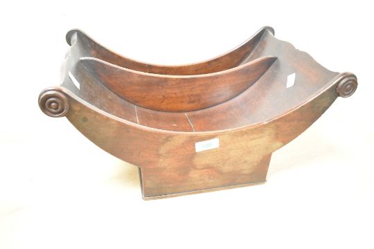 Thought to be a Georgian mahogany double cheese coaster, featuring a slatted bateau design with scrolled ends, unmarked, 43cm in diameter, condition consistent with age and use, visible scratches and surface marks to sections of the wood, and a crack to the base panels.