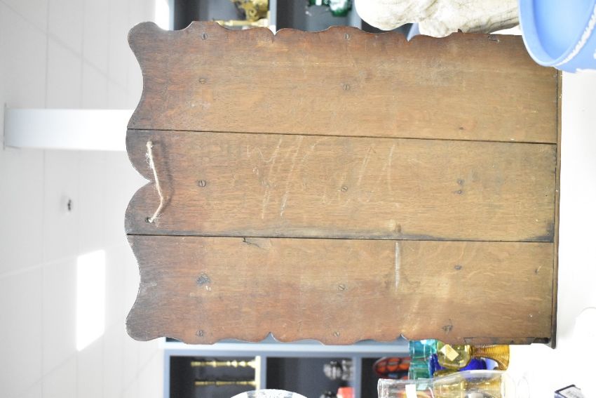 Presumed 19th-century oak spoon rack and candle box, featuring a decorative back plate, a hinged top box to the base and eight large copper and brass spoons, two having foliate and floral detailing to the handle, unmarked, condition is consistent with age and use, visible areas of wear to wood, a couple of small gouges/scratches to the front of the box, some chips to wood also, with overall surface wear.