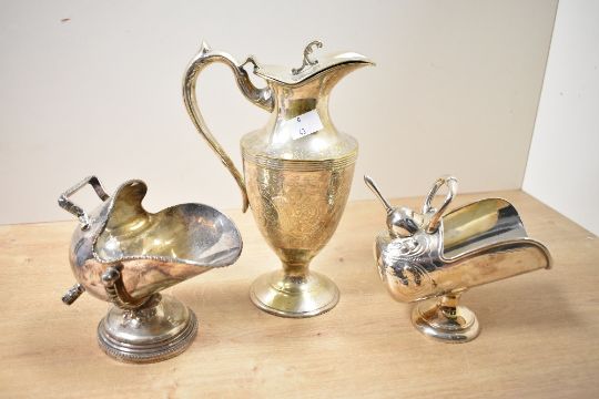 A small set of early 20th-century Silver Plated tableware, to include a pitcher, a sugar bowl, and a sugar scuttle, featuring floral and foliate detailing, marked to base, (3), condition is consistent with age and use, visible areas of surface wear.