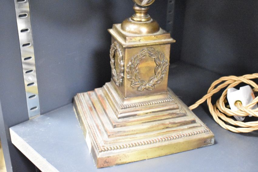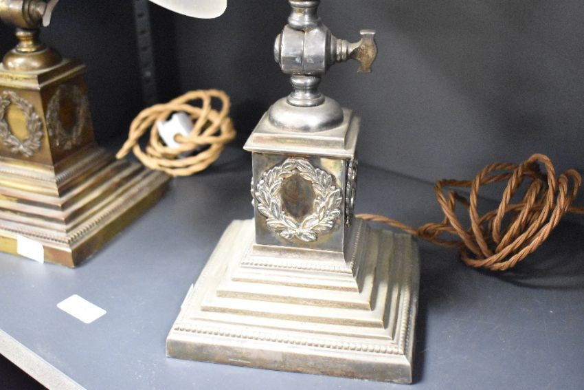 Two Edwardian brass and metal adjustable table desk lamps, featuring frosted glass bell-shaped shades, a slender swan-formed neck and a graduated base having a decorative wreath to each side, unmarked, 42cm from base to top of shade, condition is consistent with age and use, having visible surface metal wear to both bases, PAT tested, sold as seen.