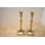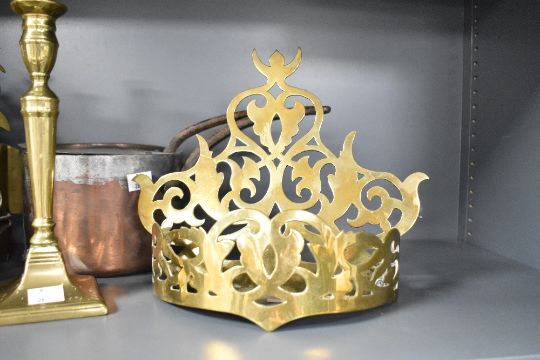 A quantity of 19th-century metal ware, to include two pierced brass wall pockets/tidies, having foliate and scrolled motifs; two Georgian-style brass candlesticks, featuring a flared candle socket, hollow tapered stem and a square stepped base; and a copper plated metal stove top pot with small frying pan lid attachment, all unmarked, (6 pieces), condition is consistent with age and use, visible metal wear to copper plate and surface wear to brass.