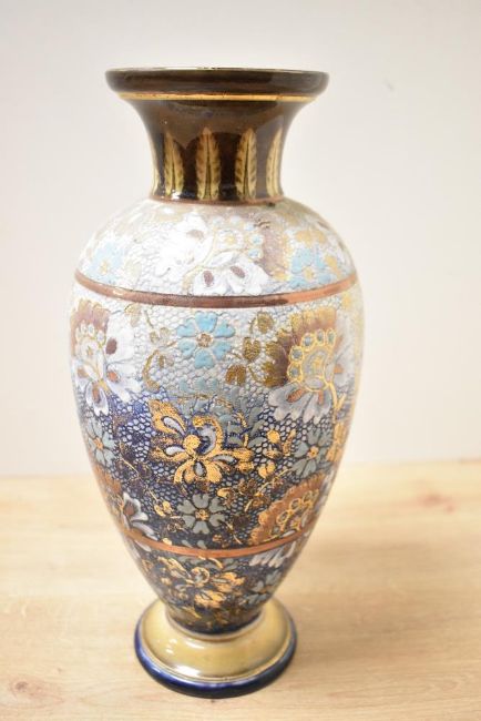 A large late 19th to early 20th-century Doulton Lambeth stoneware vase, Slaters patent, of baluster form, featuring blue, gild and cream floral decoration with lace-like detailing, impressed to base faintly, 32cm, condition is consistent with age and use, no visible chips, cracks or repaired damage.