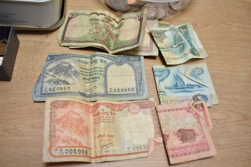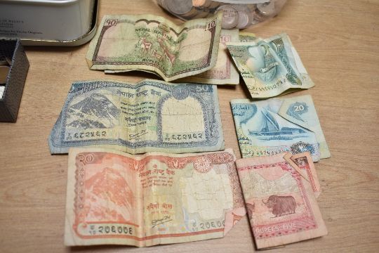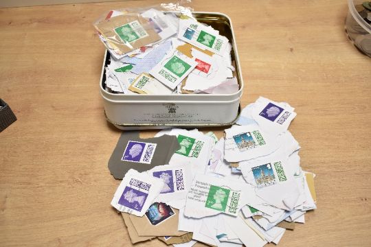 A quantity of 20th-century worldwide stamps, coins and additional bank notes, (1 tin of stamps and 1 small box of coins), condition consistent with age and use.