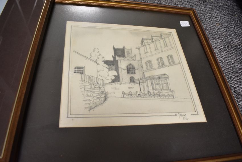 A quantity of late 19th to 20th-century framed pictures, to include a portrait of a young girl in an ornately moulded frame; a watercolour print of a church and more, mostly unmarked, (4), condition is consistent with age and use, sold as seen.