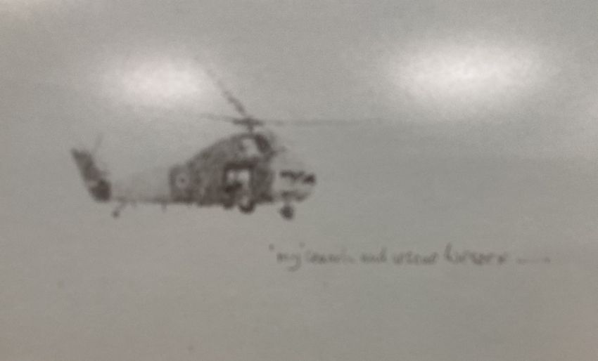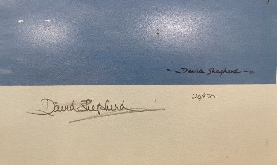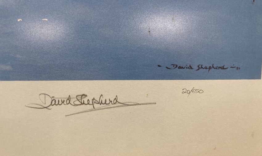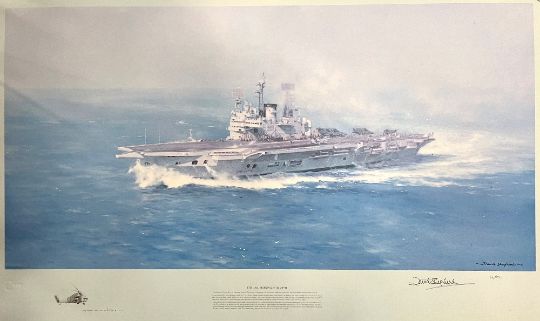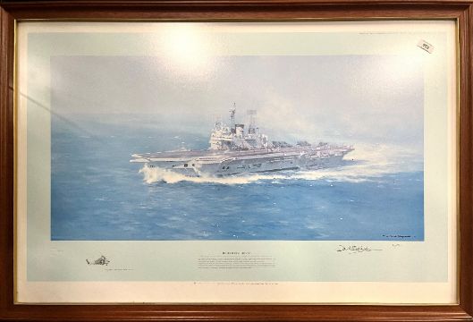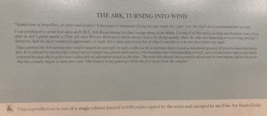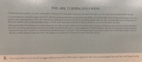 After DAVID SHEPHERD (b.1931) Limited Edition colour print, numbered 20/850 of 'The Ark Turning into Wind' being a study of the HMS Ark Royal on her final voyage home from Malta, also depicting a Fleet Air Arm Wessex Helicopter 'my search and rescue Wessex' from which the artist was able to sketch the Carrier 'at what I considered her most flattering angle'. Bearing Fine Art Trade Guild blind stamp, signed and numbered in graphite/pencil by the artist, light brown wooden framed and glazed.Original purchase invoice attached to rear.(1) A very attractive print, catching an important moment in modern Naval history.