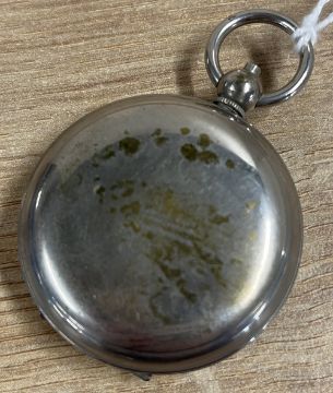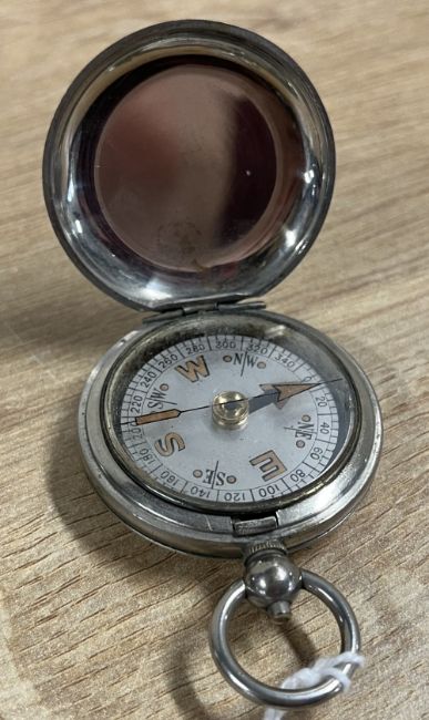 WWI British Military TERRASSE MK VI nickel plated pocket compass, Terrasse. W. Co. numbered 92441 with broad arrow and 1918 date stamped to rear, the compass glass has a yellow arrow guide, luminous markings to main compass points and is free moving, but its accuracy has not been tested. In good condition, some tarnish to case. Terrasse Watch Company was an important British compass maker during World War One and most Officers would have carried a similar pocket compass.(1)