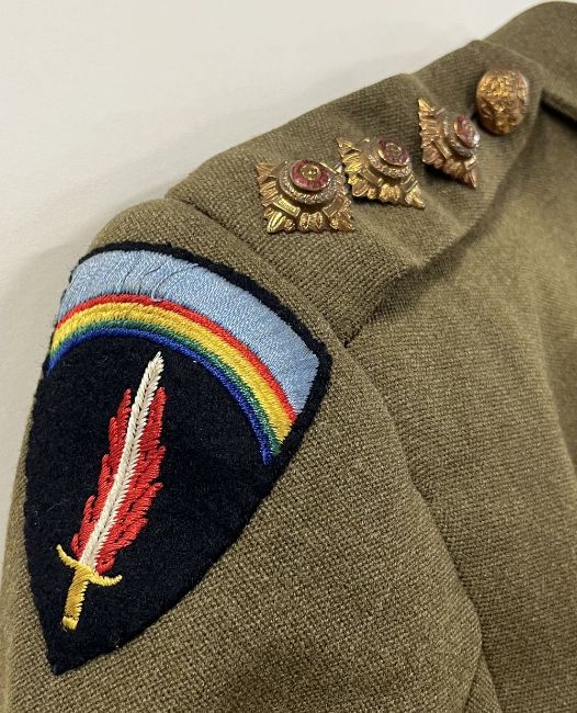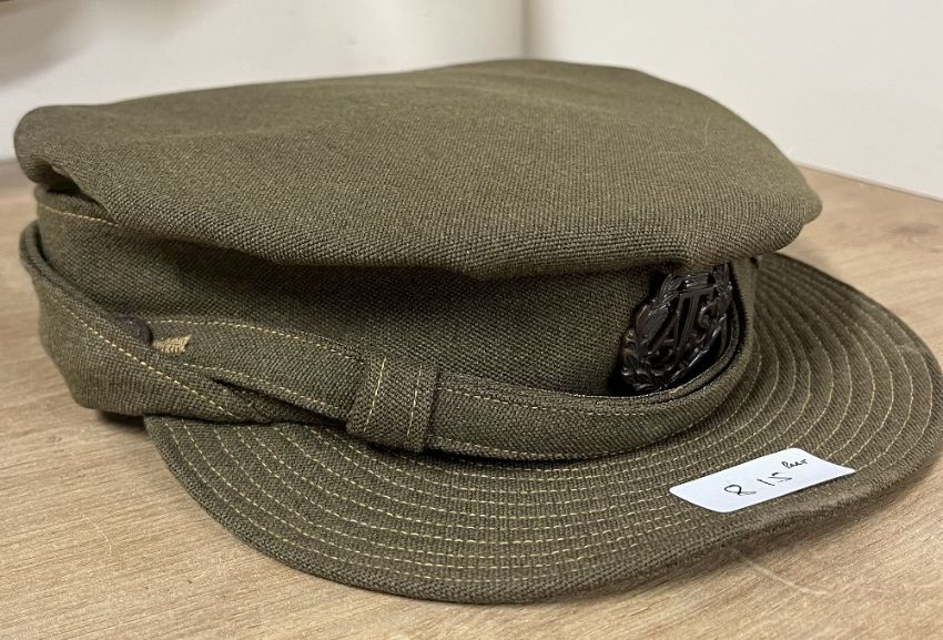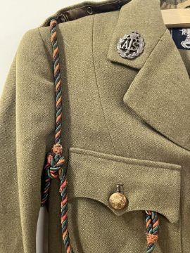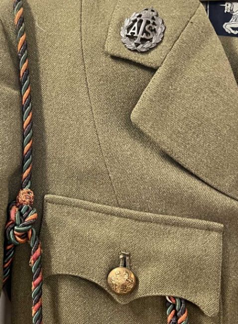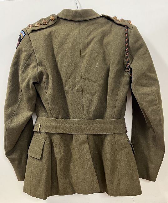 WW2-period Auxiliary Territorial Service Officer's No.2 dress/service uniform comprising standard khaki wool four-pocket tunic jacket with BURBERRYS label, having four large General Service buttons with King's Crown Royal Arms, two smaller similar GS buttons for top pockets, two King's Crown ATS dark plastic collar badges, Captain's three pips to each shoulder epaulette, a Supreme Headquarters Allied Expeditionary Force (SHAEF) Formation cloth badge to one arm and a green and red coloured lanyard with attachments, a plain khaki skirt 33cm waist 66cm length and a khaki peaked cap with card insert and King's Crown ATS badge, cloth chinstrap with two small GS buttons. Sold together with several National Savings Certificates from 1951.(3) No sizes seen throughout, in good condition for age, no moth damage seen.