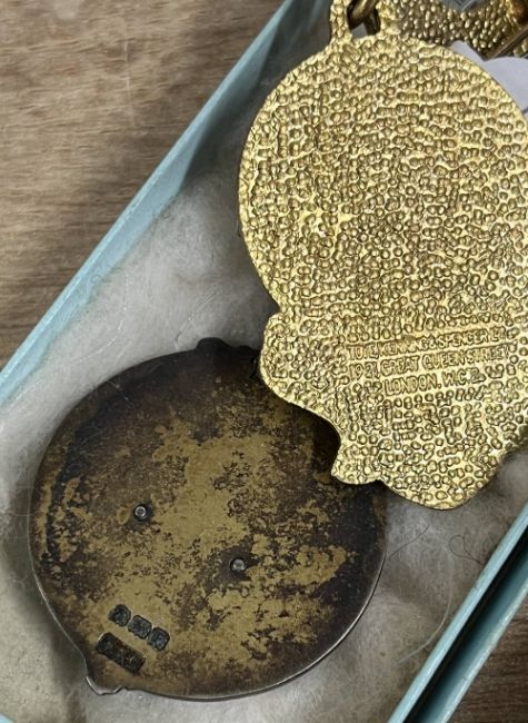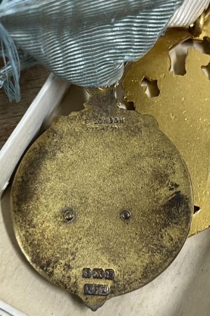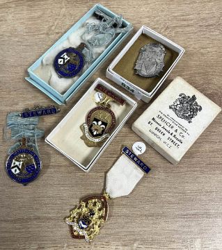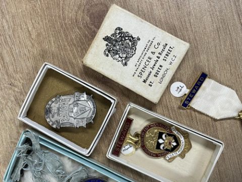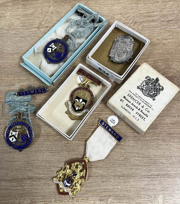 Masonic medals and/or jewels, hallmarked silver and enamel, 2no. Royal Masonic Institution for Boys 1931 hallmarked silver, with Steward clasp and pin back, all stamped FFL and F.F. London of Brighton, the light blue ribbons badly frayed, contained in Frank F. London of Brighton card box. Sold together with 2no. medals for Royal Masonic Benevolent Institution with Steward clasp and pin back in Toye, Kenning & Spencer card box and 2no. white metal R.M.I.G. Steward 1947 badges in Spencer & Co card boxes.(6)