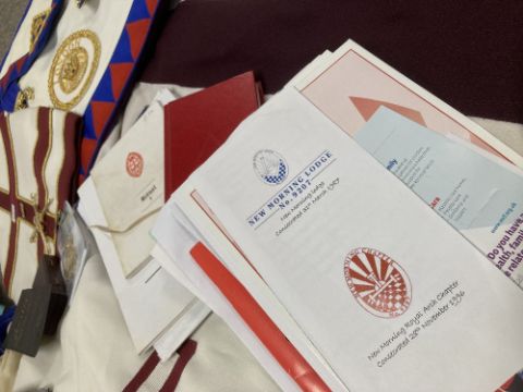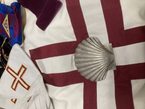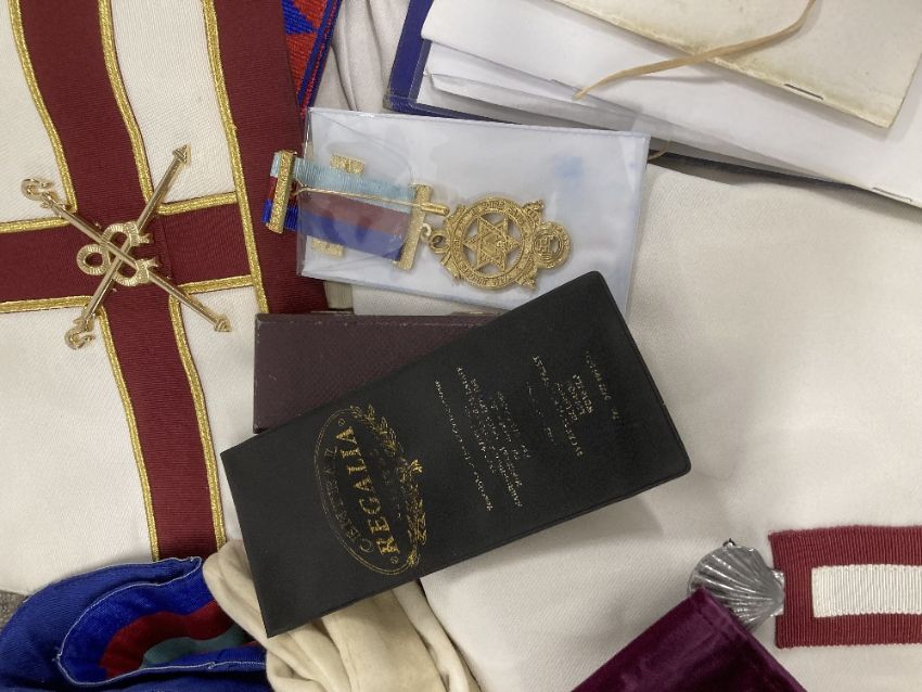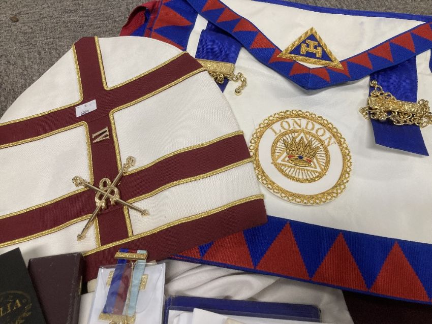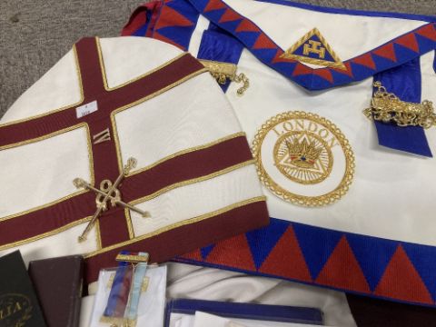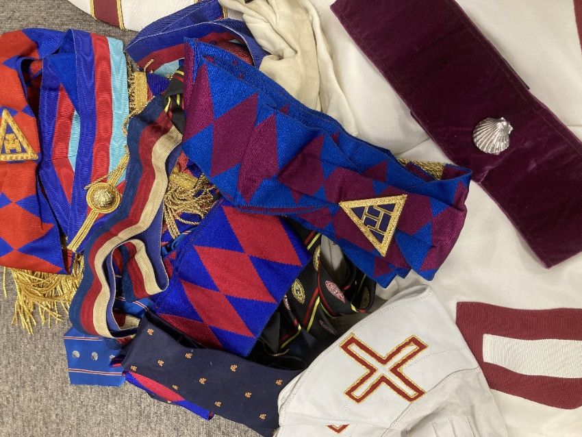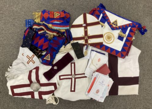 Masonic interest, 1no. bag containing articles of wear including a Holy Royal Arch Knights Templar sleeveless tunic tabard, white with maroon cross, white full-length, long-sleeved undergarmet, High Priest Mitre, white with maroon cross and gold coloured croziers, white tunic with maroon cross and white metal shell badge for the Commemorative Order of St. Thomas of Acon, white hooded cloak, several aprons with attachments, including for London and Sussex, a pair of white leather glove gauntlets with red and gold crosses, 4no. ties with various Masonic motifs, several sashes in various colours and mostly having gilt jewels, Masonic literature and pamphlets, rules, rituals etc. 3no. gilt medals and/or jewels in cases/packets.(Lot)