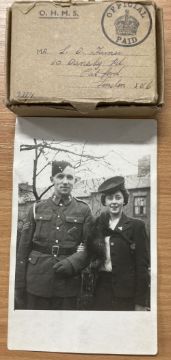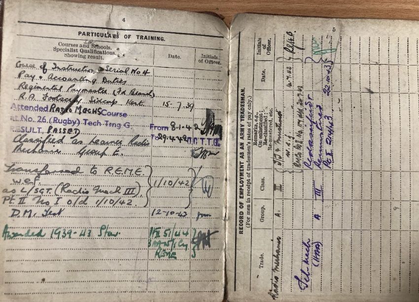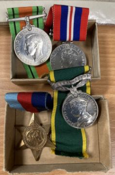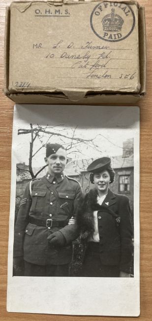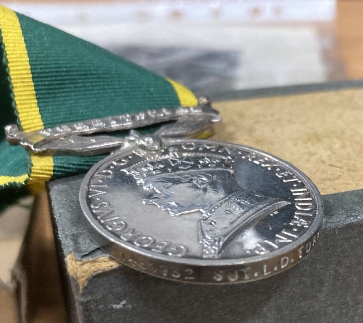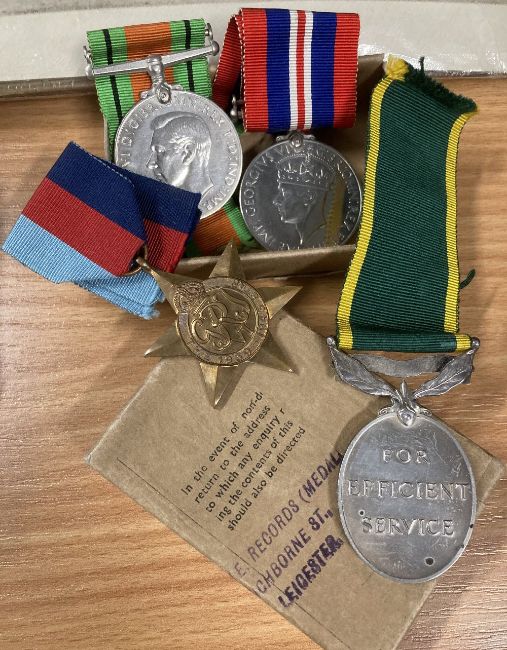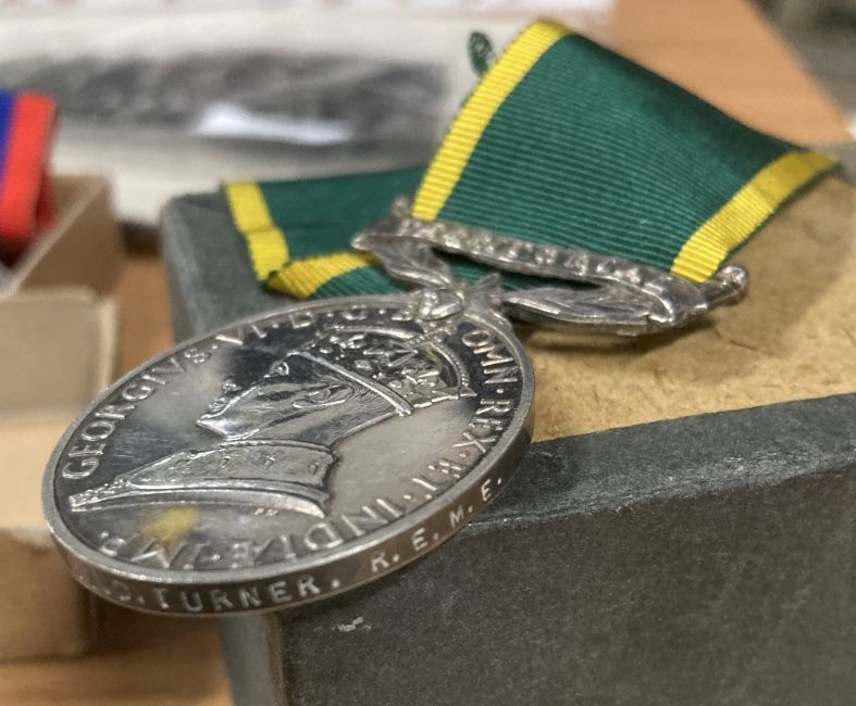 WW2 Territorial group of four medals comprising 1939-45 star, Defence and War medals, unnamed as issued on ribbons, in named R.E.M.E. Records box of issue to recipient at an address in Catford, London together with GVI BR.OMN. fixed suspender Efficiency Medal with TERRITORIAL scroll, correct impressed naming to 1431732 SJT. L.D. TURNER. R.E.M.E. Leslie Douglas Turner was born 26 August 1916 and enlisted into the Royal Artillery on 13 October 1938 and was called up for War Service as Gunner with the 60th (City of London) A.A. Regiment R.A. (T.A.) commencing 2 September 1939. He later transferred to the Royal Electrical Mechanical Engineers with effect from 1 October 1942 and was awarded the 1939-45 star in 1944 and transferred to the Reserve in 1946. Sold together with recipient's Soldier's Service and Pay Book, Soldier's Release Book, two certificates, a photograph of recipient in Sergeant's uniform with wife in 1941, a group photograph, including the recipient annotated to rear A.A. RADIO SECTION WORKSHOP (R.E.M.E.) KIDBROKE 1943 and a Past Chairman Catford & Lewisham Round Table jewel named to L.D. TURNER in H.W. Miller black box.(Lot)