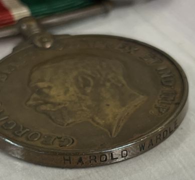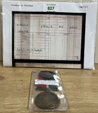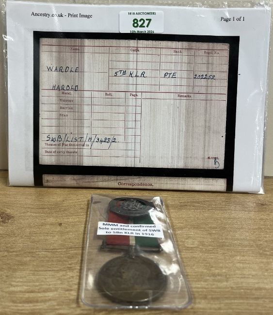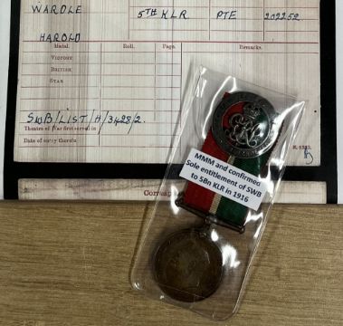 WW1 Mercantile Marine Medal with Silver War Badge, the MMM correctly impressed naming to HAROLD WARDLE and the SWB numbered 488770.(2) Online sources confirm SWB 488770 as issued to 202252 Private Harold Wardle for service with 5th KLR, 5th Battalion King's Liverpool Regiment, from enlistment on 8 February 1916 until discharged 12 September 1916 (see below) aged 21yrs and that he had not served overseas and was therefore not entitled to any medals for his Army service, the SWB being his sole entitlement. However, Harold appears to have joined the Mercantile Marine at some stage and although his record at the National Archives states entitlement to MMM AND BWM, it appears that only the MMM was actually issued. His Pension Documents are also available online and confirm his Army service and that a Medical Board found him as 'physically unfit' on 22 August 1917 and he was discharged on 12 September 1917. Sold with some copied papers, an unusual pairing worthy of further research.