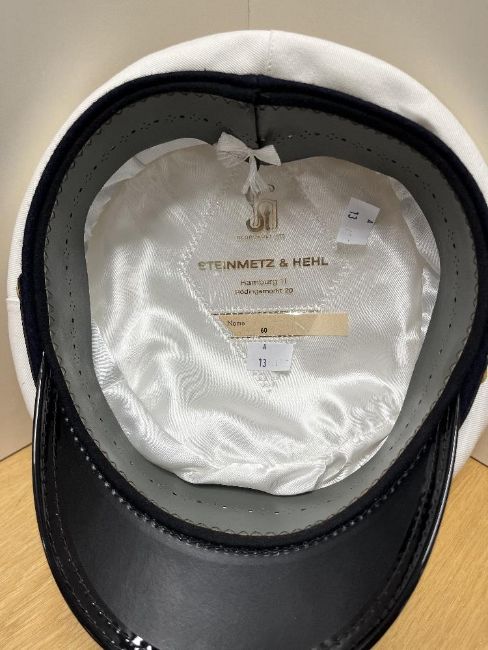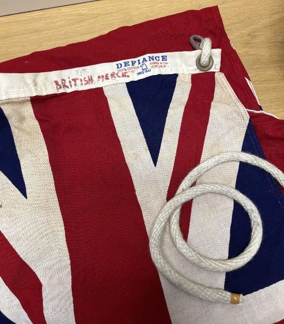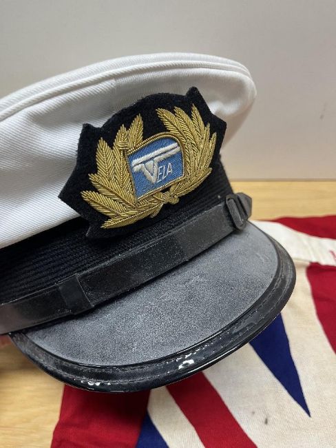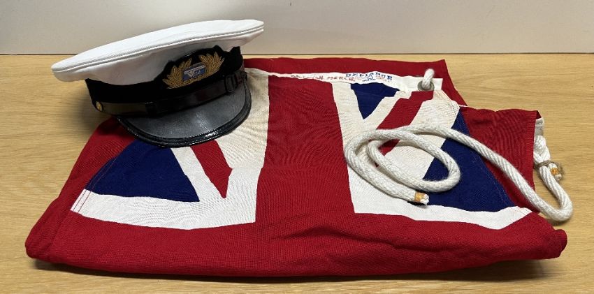 British Red Ensign flag, known as the 'Red Duster' and primarily used by Merchant Navy ships, as well as private vessels registered in the United Kingdom, dating back to the 17th Century. Made by Annin & Co of America, having 'British Merch.' in red writing, this DEFIANCE flag is in heavy-duty fabric with sewn panels and reinforced seams, red field with 40cm x 70cm Union Jack in the upper left corner, vibrant colours, brass-coloured eyelets with woven rope which is broken near one eyelet, otherwise in very good condition for age, 85cm x 147cm overall. Sold together with a German naval cap with makers plastic label for Steinmetz & Hehl of Hamburg, size 60, ribbed white top and inner lining, black ribbed woven band, leather peak, inner and chinstrap with two German marine buttons and having shipping line gold bullion thread embroidered badge for VELA fixed to front centre. Some discolouration to both items.(2)