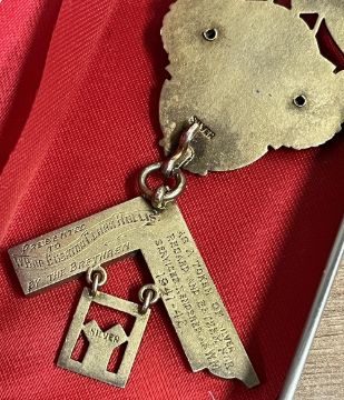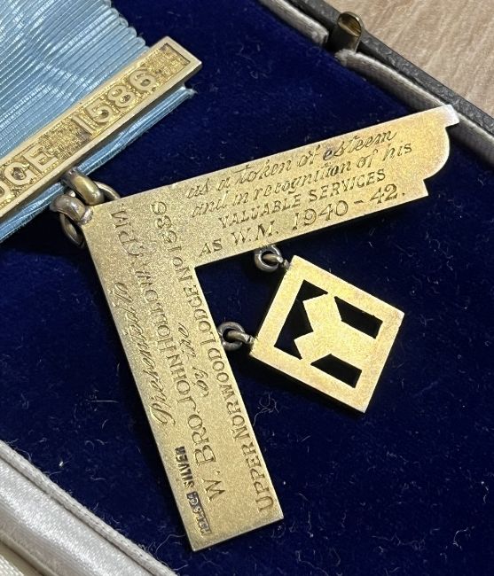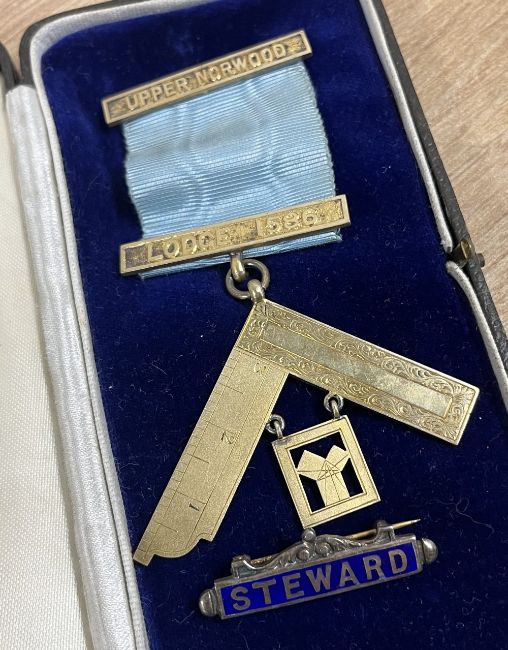 Masonic Past Worshipful Master set square medal/jewel for Upper Norwood Lodge 1586, engraved to reverse 'Presented to W.Bro. John Holloway P.M. as a token of esteem and in recognition of his Valuable Services as W. M. 1940-42', stamped HTL&Co Silver and in its dark brown box with blue felt and ebony interior H.T. Lamb & Co, Masonic Jewellers of London case. Sold together with another, smaller, having vivid coloured enamel centrepiece featuring a church, for Beddington Lodge No. 5492 engraved to reverse 'Presented to W.Bro. Egerton Clark Hollis as a token of regard and esteem for services rendered as W. M. 1941-42', stamped silver and with pin clasp inscribed 'W.M. Quadragesimus Quartus 1977-78' and a silver hallmarked blue enamel STEWARD pin badge.(3)