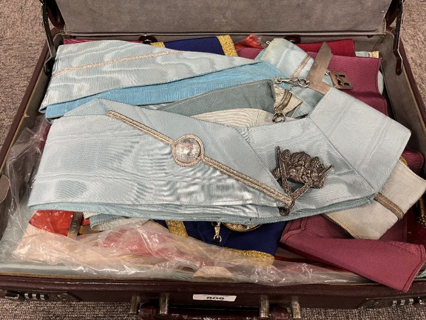 Masonic interest, a brown leather suitcase 10cm x 45cm x 34cm containing a quantity of Masonic regalia including 2no. aprons with attachments, 3no. crimson and gold sashes, one with triangular jewel engraved reverse 'Chapter of Emulation No.40', one similar engraved to reverse 'Presented to Viking Chapter No.5014 by Comp. Peter C. Bargh, 1no. blue and gold sash with enamel and silver stamped Sussex jewel, 3no. light blue and silver sashes, one with hallmarked silver set square engraved reverse 'Presented to W.Bro. John R. Holloway as a token of regards esteem by the Upper Norwood Lodge 1586 1940-41 - 1941-42', one being white metal in form of a compass and cornucopia engraved on reverse 'Presented by The Founders of New Morning Lodge No.9207' and one with white metal set square, a Provincial Grand Lodge of Surrey Annual Meeting 2005 programme and 4no. Programmes for the Inauguration of the Metropolitan Grand Lodge and Metropolitan Grand Chapter of London held at Royal Albert Hall on 1st October 2003.(Lot)