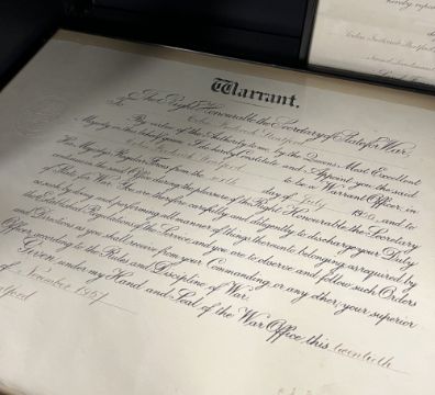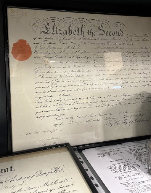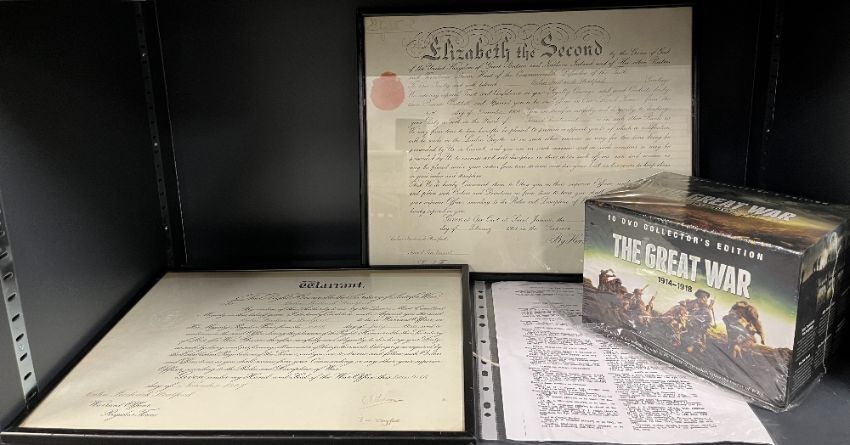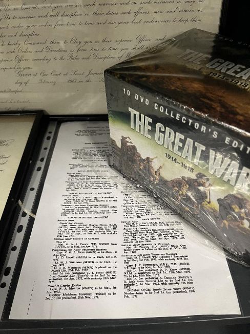 Post-WW2 Commission Documents for Colin Frederick STRATFORD, two framed and glazed, one 32cm x 38cm dated 20 November 1957 appointing recipient as Warrant Officer in HM Regular Forces and one 35cm x 42cm dated 7 February 1967, given and sealed by HM Queen Elizabeth as Colonel in Chief, appointing recipient as Second Lieutenant. Colin Frederick Stratford was born on 6 January 1928 and enlisted into the General Service Corps on 27 September 1945. Transferred to the Loyal Regiment in May 1945, he served with the BAOR, November 1948-March 1951 and the FARELF, May 1951-November 1952. Transferred to the Manchester Regiment in November 1952, he served with the BAOR, September 1954-June 1957. After a short period with the King?s Regiment, he was posted to the Loyal Regiment, serving with them as part of FARELF, October 1958-January 1960; BAOR, January 1960-January 1962, and June 1963-June 1964, and British Guiana, August-December 1965. As a Warrant Officer Class 1 he was discharged to a commission on 30 November 1966. He attained the rank of Captain in April 1972. London Gazette copies. This information taken from the Noonans online archive, recipients medal group comprising General Service 1918-62, 1 clasp, Malaya, G.VI.R. (14473494 Sjt., Manch.); General Service 1962, 1 clasp, Northern Ireland (Capt., QLR); Army L.S. & G.C., E.II.R, 2nd issue, Regular Army (Capt., King?s Own Border), mounted court style as worn, having been sold in 2008. Sold together with an unopened ten DVD boxed Collector's Edition of The Great War 1914-1918, by Military History, with a collective running time of approximately fourteen hours.(3)