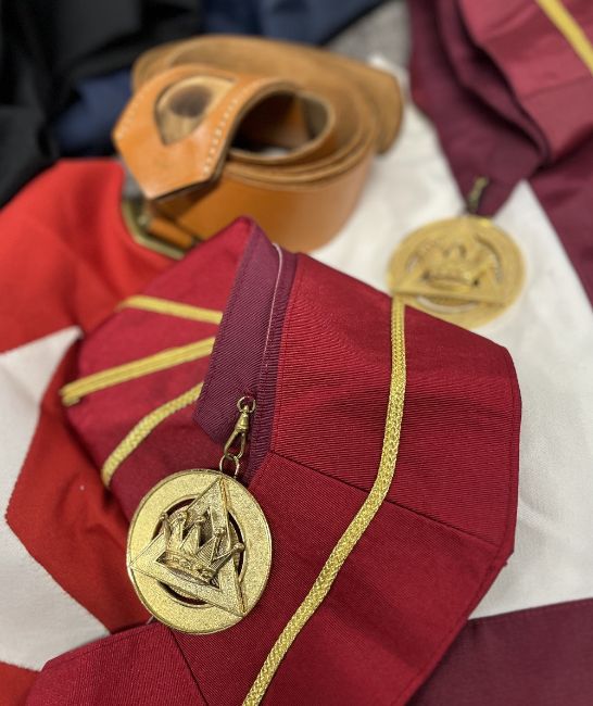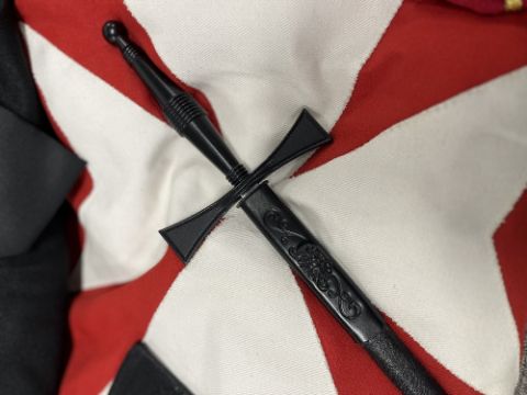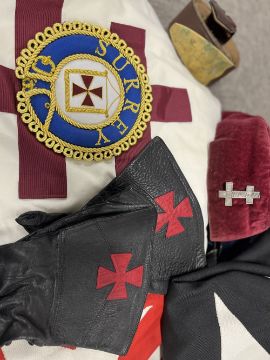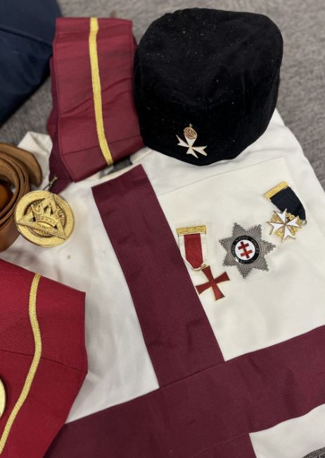 Masonic interest, 1no. bag containing articles of wear related to the Orders of the Temple and of St. John of Jerusalem, Palestine, Rhodes and Malta etc including a white long-sleeved tunic tabard with maroon cross and having two associated medals and/or jewels pinned to breast along with a seven pointed star badge with enamel centre surrounded by motto In.Hoc.Signo.Vinces. a white with maroon cross hooded cloak with Surrey embroidered roundel, a red with white cross sleveless tabard, a black hooded cloak with white Cross of St. John, 2no. crimson and gold embroidered sashes having gilt jewels, 2no. black and silver emroidered sashes, a pair of black leather glove gauntlets with red Cross of St. John, a black tie with motif for the Provincial Priory of Sussex, also having white and red Cross of St. John, 2no. Felt pillbox hats, one black and one crimson, 2no. Leather belts, 4no. gilt and enamel medals, jewels or badges, a Masonic Ceremonial sword with ornately engraved 70cm blade, black handle in its part metal part plastic scabbard and some Masonic literature and pamphlets, rules, rituals etc.(Lot)