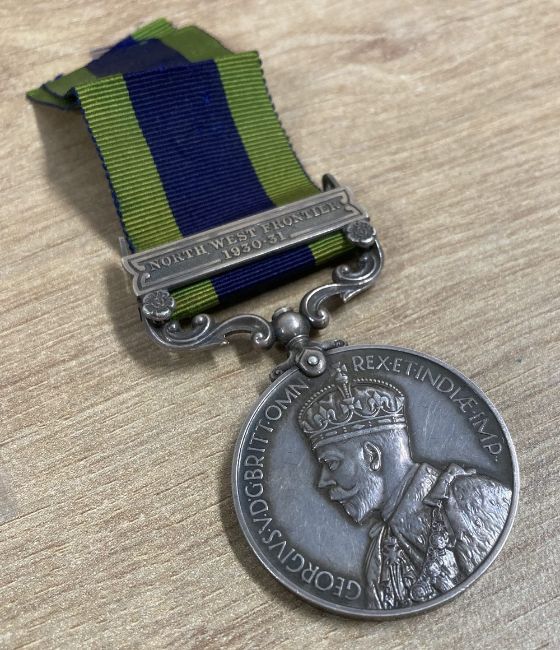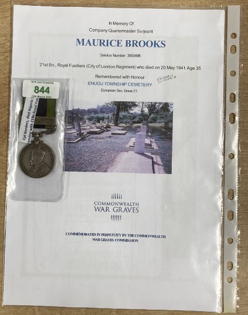 Pre-WW2 India General Service Medal with clasp North West Frontier 1930-31, later a casualty during World War Two. Correctly impressed naming to 3593496 CPL. M. BROOKS. BORD. R. Online sources confirm this award to Corporal Brooks for service with 2nd Battalion Border Regiment on the North West Frontier during the Red Shirt Rebellion in the period from 23rd April 1930 to 22nd March 1931 and that it was issued to him in 1934 on Army Reserve.(1) The CWGC lists MAURICE BROOKS, aged 35yrs and serving as Company Quartermaster Sergeant with 21st Battalion Royal Fusiliers (City of London Regiment) as died on 20 May 1941 in Nigeria, West Africa and Remembered with Honour at Enugu Township Cemetery in Eastern Nigeria, where he is buried alongside several other British comrades. Sold together with some copied research and an unusual and scarce WW2 casualty of war for Nigeria.