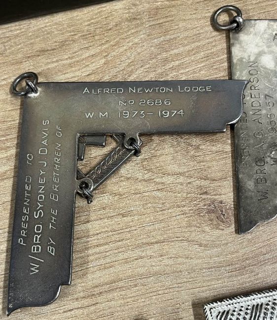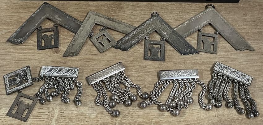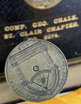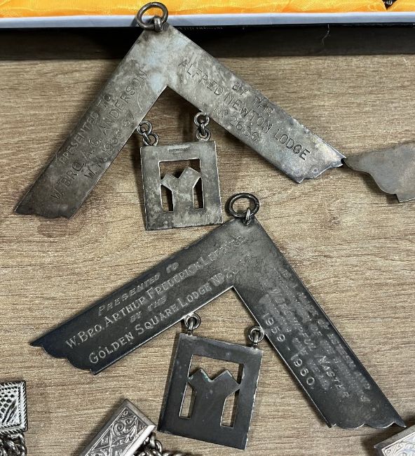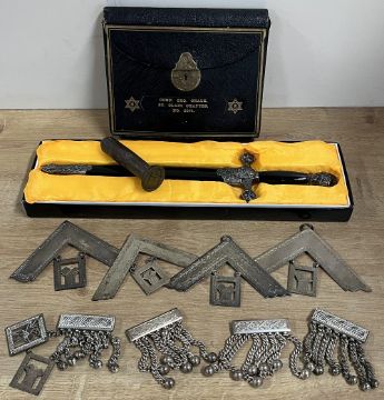 Masonic interest, Knights Templar sword/dagger having 20cm stainless blade, decorative hilt and black scabbard, 35cm overall, together with miniature sword/dagger used as a letter opener, 14cm overall and a Royal Arch Dublin Lodge 207 brass stamp on wooden handle, 10cm overall. Sold together with St. Clair Chapter No.2074 black leather pouch with key, containing 4no. Worshipful Master collar jewels, white metal thought to be silver plated but not marked in any way, 3no. engraved on the reverse for various lodges and 4no. Masonic pin-back apron tassels each having seven free-moving chains ending in balls, 2no. hangers, one stamped for Bliss London.(14)