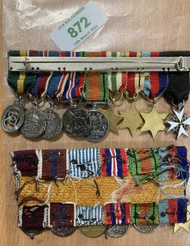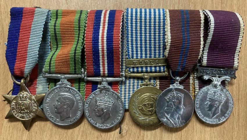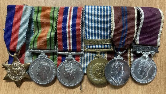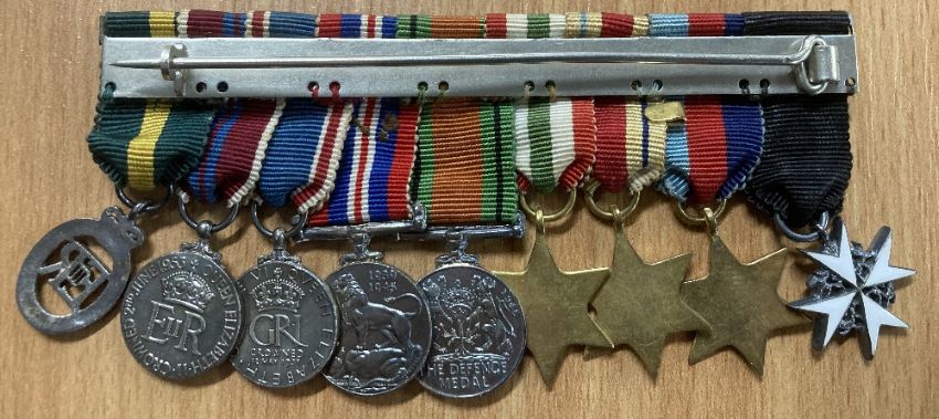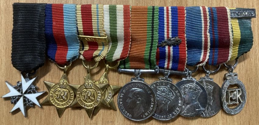 Miniature medals, two unnamed groups mounted as worn, the first group of nine on metal pin bar comprising enamelled Officer of the Order of St. John, 1939-45, Africa with 8th Army clasp, Italy stars, Defence and War medal with Mention in Despatches emblem, 1937 Coronation, 1953 Coronation, EII Efficiency Decoration with Territorial clasp, the second group of six on cloth backing comprising 1939-45 star, Defence and War medals, UN Korea, 1953 Coronation, GVI Regular Army Long Service and Good Conduct.(2)