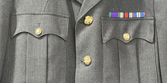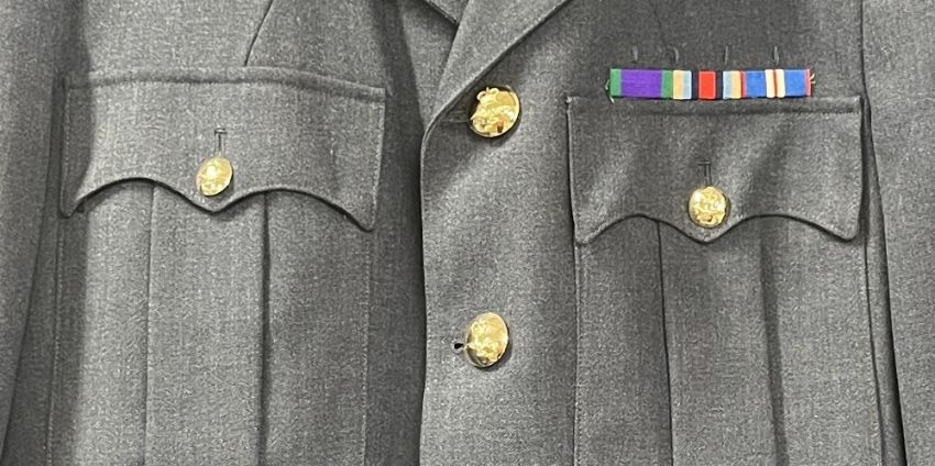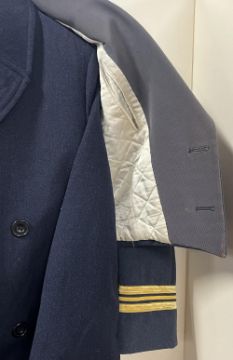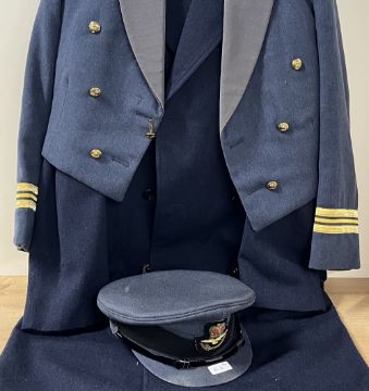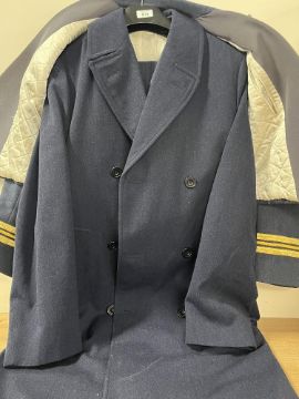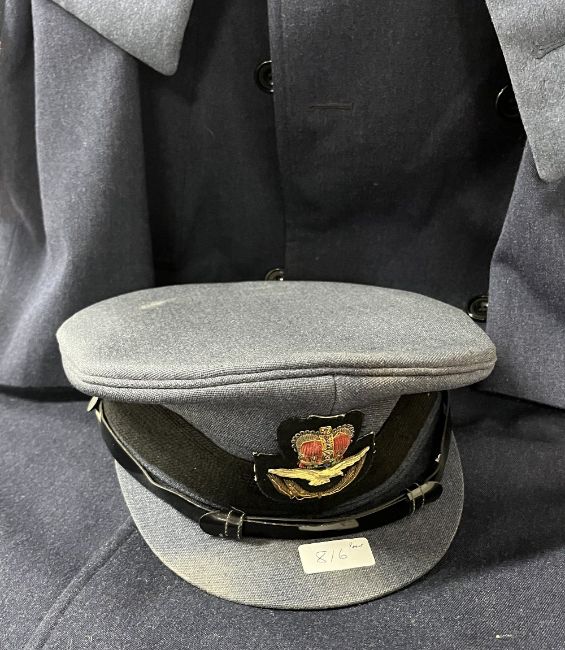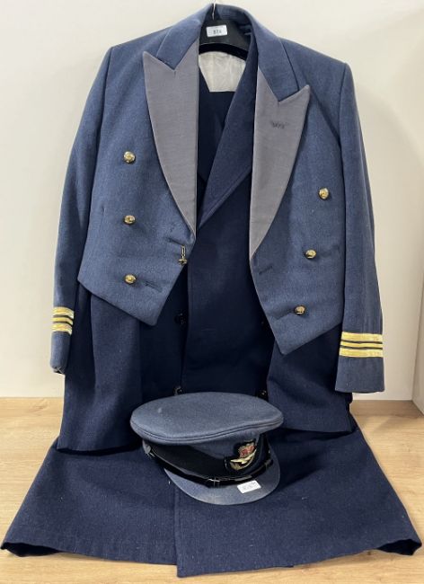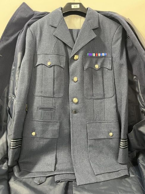 RAF Squadron Leader post-war uniforms comprising jacket, waistcoat with trousers by Moss Bross, no sizes seen, jacket having ribbons for General Service Medal, Operational Service Medal for Afghanistan and Queen's Golden Jubilee Medal 2022 and Squadron Leader rank insignia to cuffs, a Royal Air Force mess-dress uniform jacket with gold-laced Squadron Leader rank insignia to cuffs and an RAF Officers dress cloth-covered peaked cap by Weston Ltd size 58, leather inner-band, black leather chin strap, with embroidered bullion Queen's Crown and gilt eagle badge. Sold together with RAF all-ranks lined woollen raincoat size 182/192 in dark blue by Dashmore Clothing Ltd. In good condition as worn, with all buttons present and no visible moth damage.(6)