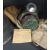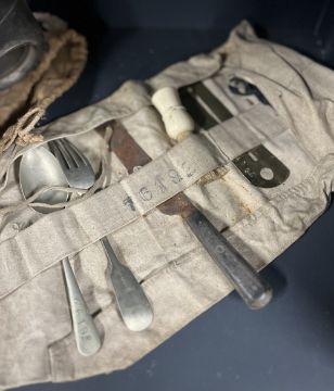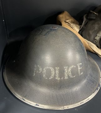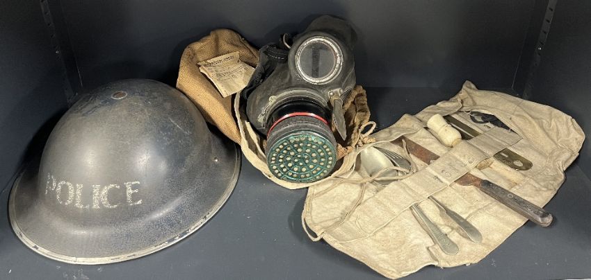 WW2 1939 Home Front Police Brodie Helmet retaining some original blue painted body, with 'POLICE' in white to the front, the internal rim stamped RO. Co. VR and I above 1939, early pattern leather lining with canvas chinstrap, in good condition for age. Sold together with WWII British Home Front Civilian Duty Respirator gas mask, stamped 'NORMAL' 'S.G. & ?(illegible) and date SEP 1939 22739 AVON in its khaki canvas bag with carry strap, a Civilian Duty Respirator - Record Card and a knife, spoon, fork set, bristle shaving brush and a brass military button stick, the spoon of Duchess Silver and stamped 76192, the fork hallmarked silver, the knife with badly rusted blade, the button stick stamped 76192, all contained in original roll-up partitioned canvas bag.(3)