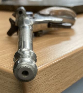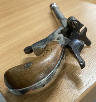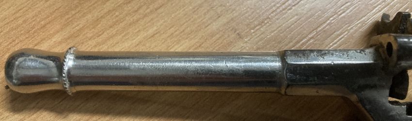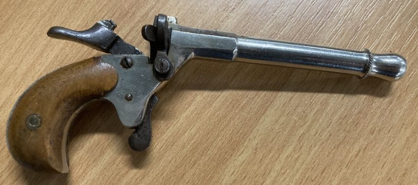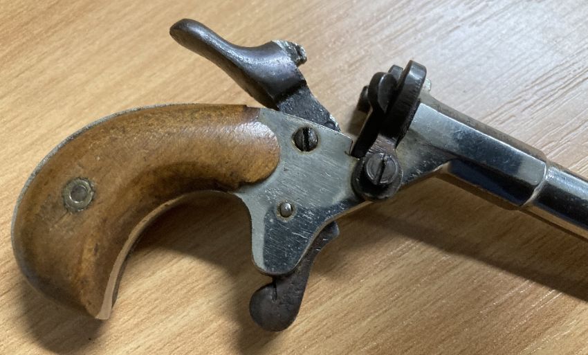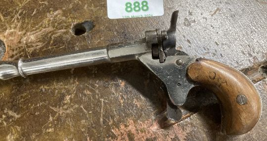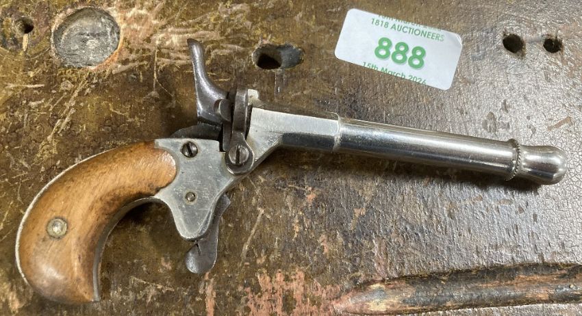 German Flobert-type 'parlor' single-shot rimfire blank firing pistol, thought to be 19th Century or early 20th century, two-piece walnut grip in good condition, the action in working order, 8.5cm long and 1cm diameter nickel plated barrel which has been blocked and a top-venting hole drilled near the action, no makers marks seen, 14cm overall.(1) Often called a Postman's Pistol, which fired blanks and/or caps and was used by postmen - and cyclists - to scare dogs away, without harming them. Buyer must be over 18, proof of identity required, thank you.