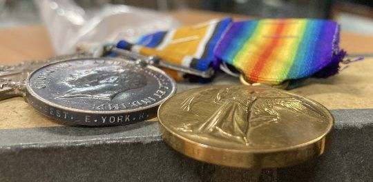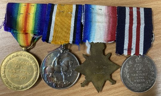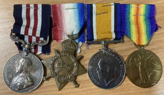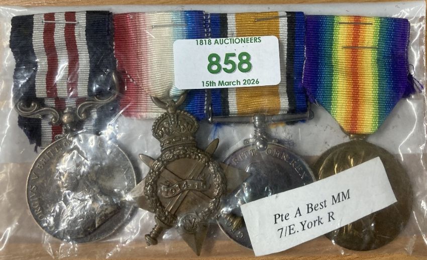 WW1 Military Medal group of four to the East Yorkshire Regiment comprising GV uncrowned head, swivel suspender Military Medal correctly impressed naming to 16229 PTE. A. BEST. 7/E. YORK: R. 1914-15 star, British War medal correctly impressed naming to 16229 PTE. A. BEST. E. YORK: R. and Victory copy medal impressed similarly in smaller style, the BWM with attractive laquering, modern ribbons and all stapled to card.(4) Online sources confirm the award of the trio to Private Alexander Best for service with the East Yorkshire Regiment in France from 9 September 1915 and that he was transferred to Class Z reserve. He first served with the 8th Battalion East Yorkshire Regiment, landing at Boulogne, however he was awarded the MM For Bravery in the Field whilst serving with the 7th Battalion as confirmed in the London Gazette Supplement of 11 February 1919, further stating his hometown as Clydebank. During 1918, the 7th Bn East Yorks took part in The Battle of St Quentin, The Battle of Bapaume, The Battle of Amiens, The Battle of Albert, The Battle of Bapaume, The Battle of Havrincourt, The Battle of Epehy, The Battle of Cambrai 1918, The pursuit to and Battle of the Selle, The Battle of the Sambre and on 11.11.1918 they ended the war at Aulnoye in France. Worthy of further research.