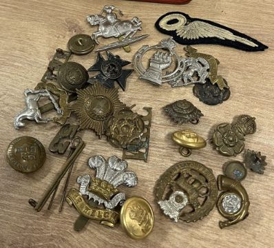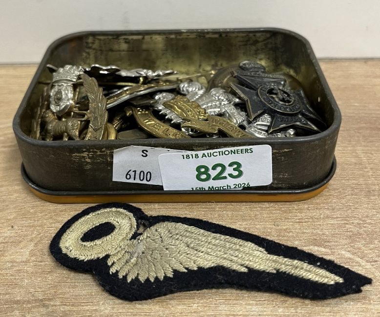 Military badges, buttons, shoulder titles comprising a WW1 metal wound stripe, MGC, RWF and 53 shoulder titles, a Royal Air Force Observer embroidered half-wing brevet, thought to be WW2-period, a Church Lads' Brigade C.L.B. King's Royal Rifle Corps Cadets blackened cap badge, a Coldstream Guards cap badge and uniform button, a Queen Victoria-period Royal Artillery button manufactured by Player Bros of Birmingham, a Duke of Wellington's West Riding Regiment uniform button, cap badges for The Welch, Royal Armoured Corps, York and Lancaster, King's and others, all contained in a vintage Wills's Cut Golden Bar Tobacco tin.(24)