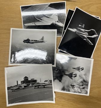 Post-WW2 Air Ministry and De Havilland black and white photographs, mostly 16cm x 21cm and comprising various aircraft, mainly in flight, including several Chipmunk DHC1, De Havilland Vampire trainer and several DH115 Vampire T.11 which first flew 15 November 1950, Vampire night-fighter, several Venom including protype, several Sea Vixen prototype including four of those that entered Operational Squadron Service with the Royal Navy during 1959, Hornet, Vampires of 601 and 604 Squadrons RAF, Mosquito 6 on a fire mission, and Mosquito P.R. Photographic reconnaissance, four Royal Navy HMS Heron dated 1966 including two of helicopter, Hercules meteorological research aircraft, Boeing Washington, North American Mustang etc and six Scottish Aviation of the first JETSTREAM T.Mk.1 made for the Royal Air Force and handed over at Prestwick on 26 June 1973 as multi-engine pilot trainer including one in colour.(70)