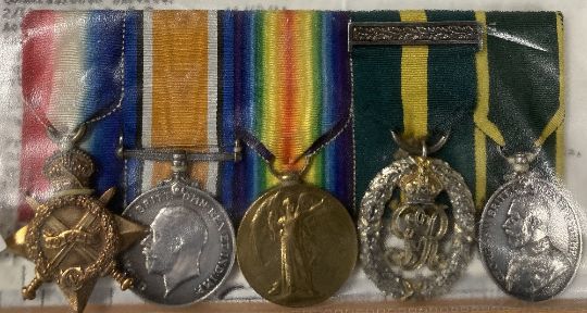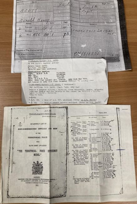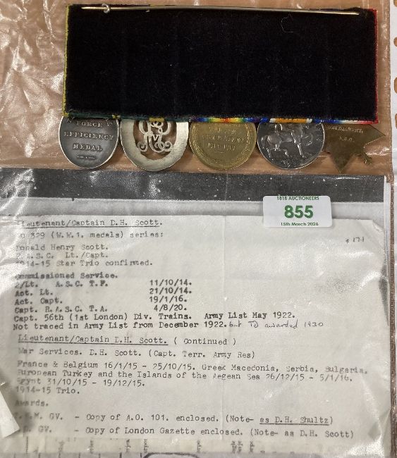 WW1 and later unusual Officer's group of five to recipient who was awarded a pre-war Territorial Force Efficiency Medal for service with the 5th (City of London) Battalion, London Regiment (London Rifle Brigade) in April 1914 as Sergeant SHULTZ and then appears to have 'changed' his German-sounding surname of SHULTZ to the 'more common' British surname of SCOTT! The group, mounted on a pin bar for wearing, comprises 1914-15 star correctly impressed naming to LIEUT. D.H. SCOTT. A.S.C. British War and Victory medals correctly impressed naming to CAPT. D.H. SCOTT. GV Territorial Decoration unnamed as issued, having oak bar brooch and GV swivel suspender Territorial Force Efficiency Medal correctly impressed naming to 7911 SJT. D.H. SHULTZ.(this feint, heavily rubbed) 5/LOND. REGT. Using a magnifying glass, it is just possible to make out the recipient's original name of SHULTZ.(5) Sold together with prior research relating to the awards of the WW1 trio, TFEM and TD from the London Gazette and to Lieutenant/Captain Scott's extensive WW1 war service with the Royal Army Service Corps in France, Belgium, Greek Macedonia, Serbia, Bulgaria, Turkey, which is thought to have been gleaned from the Army List. An interesting group and worthy of further research.