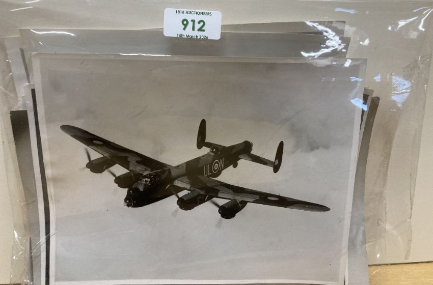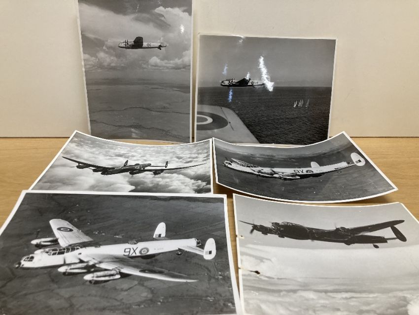 Post-WW2 Royal Air Force Air Ministry black and white photographs, 57no. mostly 16cm x 21cm, including a Vickers Vernon Ambulance aircraft in Iraq, Wellington, several Avro Lancaster, Lincoln and Shackleton, Lancastrian prototype, Boulton & Paul Balliol and Delta Wing, an Avro Tutor bi-plane trainer and three miscellaneous aircraft photos including an RAF Lancaster returning from a bombing mission in France during WW2 and a Fairey long-distance monoplane at Aboukir, which apparently crashed in Algeria at a later date. Many annotated in pencil on the reverse, all black and white.(60)