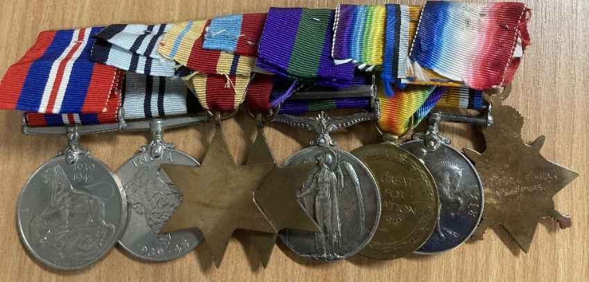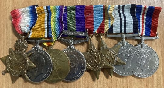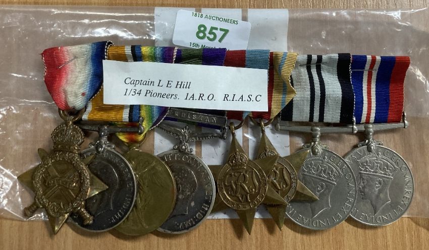 WW1 and WW2 Indian Army Officer's group of eight comprising 1914-15 star correctly impressed naming to 2/LIEUT. L.E. HILL, 1/34/PNRS. British War and Victory medals correctly impressed naming to LIEUT. L.E. HILL. GV coinage head, fixed suspender General Service Medal 1918-62 with clasp KURDISTAN correctly impressed naming to CAPT. L.E. HILL. I.A.R.O. 1939-45, Africa stars, India Service Medal, War Medal, these four unnamed as issued, the group stapled to card.(8) An interesting Officer's group, worthy of research.