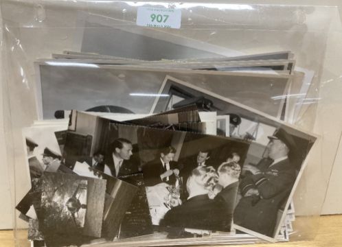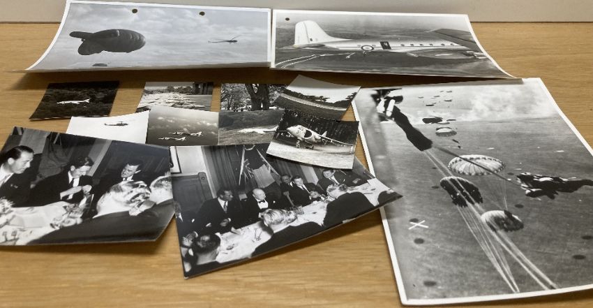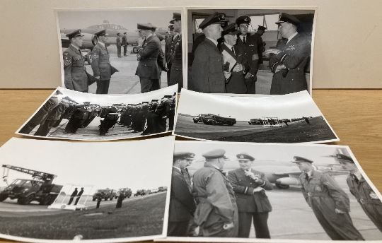 Royal Air Force post-WW2 period collection of 16cm x 21cm Air Ministry photographs comprising 33no. of various RAF personnel, aircrew in readiness to fly and groundcrew in maintenance rolls, including some parachute air drops, an RAF Regiment Officer on exercise with ground forces of the Aden Protectorate Levies, a group of RAF pilots returning from training in Canada, Sgt Duncan and Leading Aircraftman Keates after having received the Royal Victorian Order from the King and a photo of the Knight Commander of the RVO 1951 award document to Andrew McKee later Air Marshall Sir, KCB, CBE, DSO, DFC, AFC. Sold together with 10no. 5.5cm x 5.5cm photographs of Harrier Jump Jets, 7no. 9cm x 12.5cm photographs of a luncheon featuring Sir Winston Churchill and 9no. 11.5cm x 15.5cm photographs featuring RAF Officers at an inspection of RAF personnel. The AM photos numbered, several with annotated explanations and descriptions.(59) An interesting and collectable lot, worthy of further research.