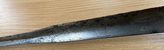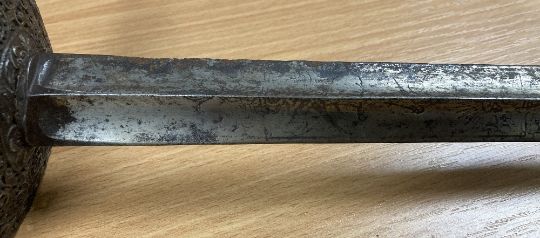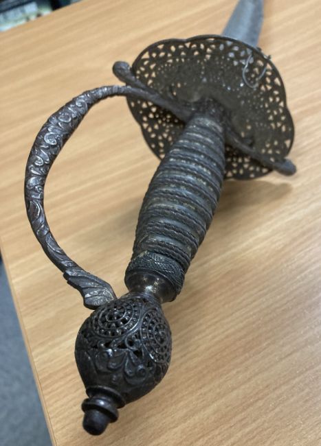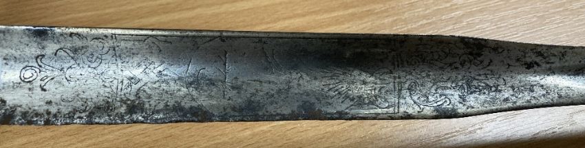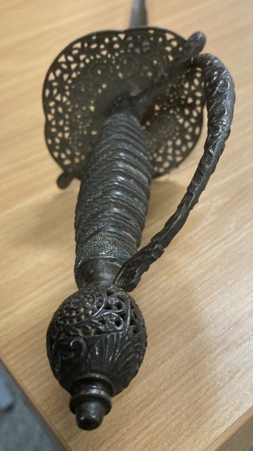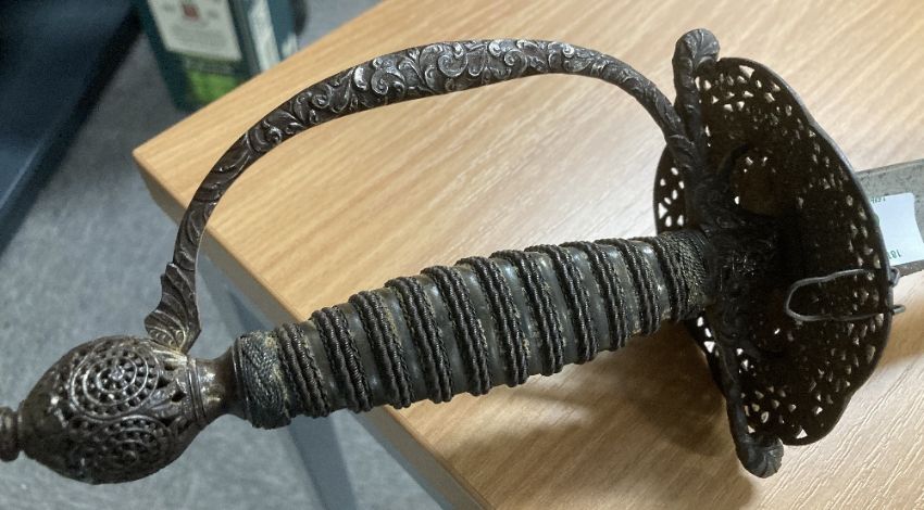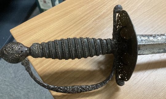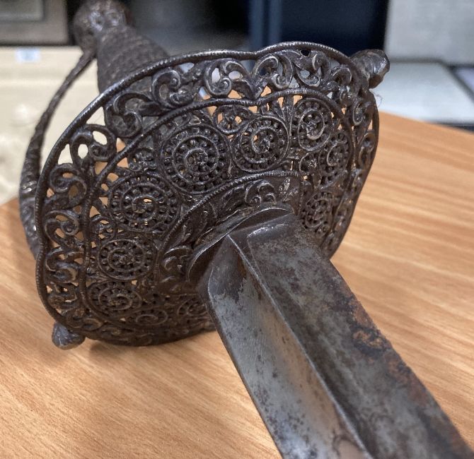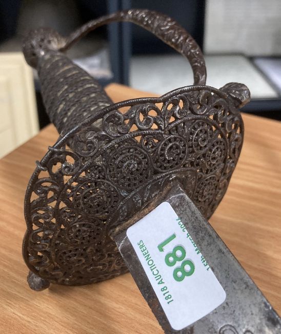 George III style Court Sword or Rapier, tapered triform/triangular fullered steel 78cm blade, with engraved parrot and floral decoration, tarnished and rusting towards tip, cast patinated turned wire handle grip, pierced decoratively engraved guard, knuckle bow and pommel, 96cm overall.(1) Buyer must be over 18, proof of identity required, thank you.
