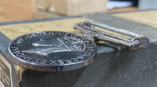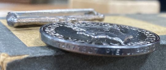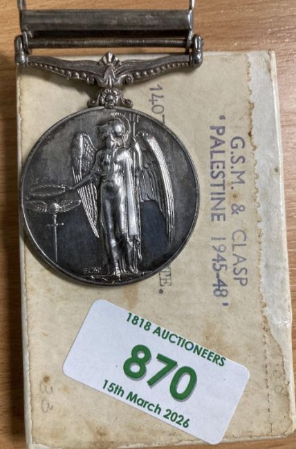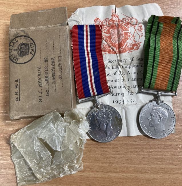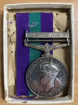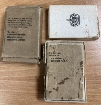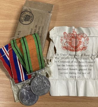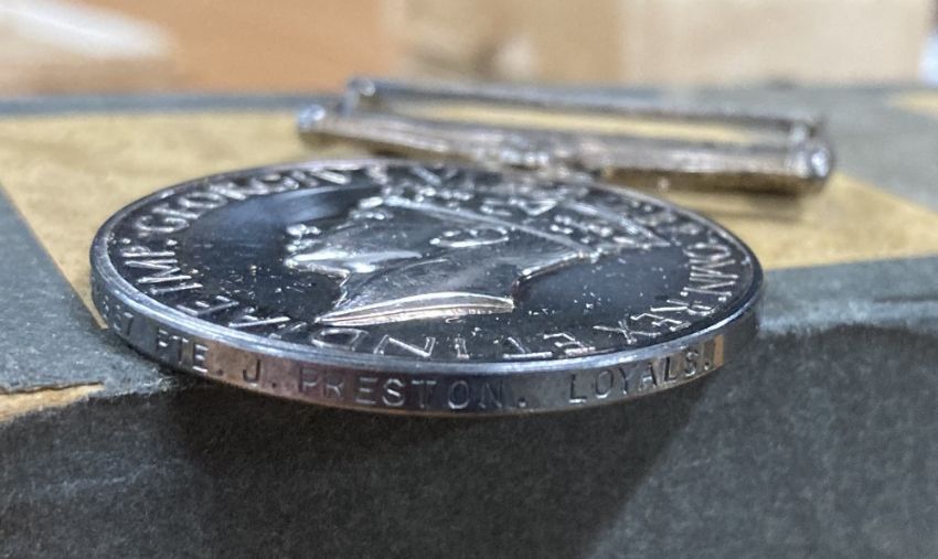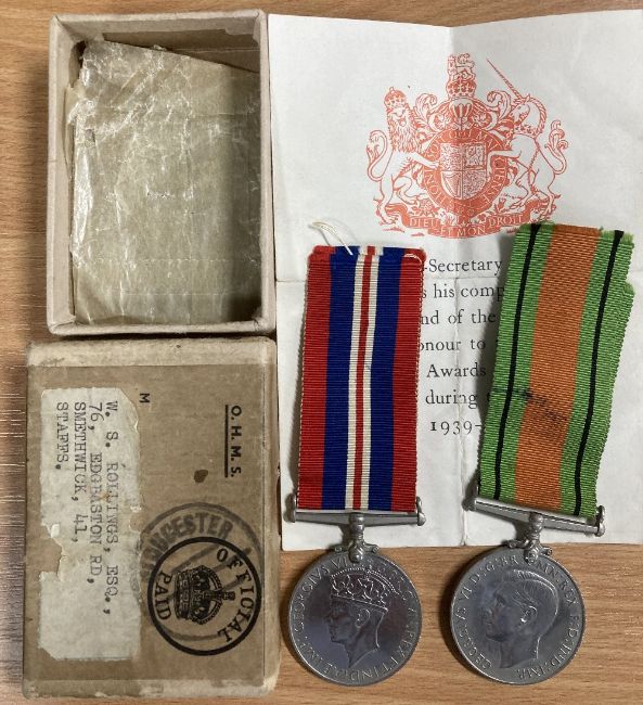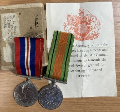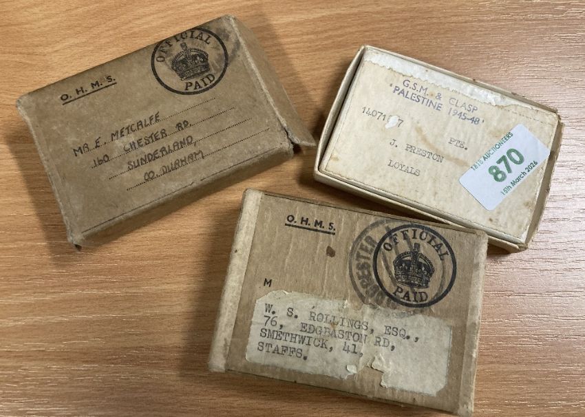 General Service Medal 1918-62 GVI Ind Imp, correctly impressed naming to 14071867 PTE. J. PRESTON. LOYALS. in named box of issue with ribbon. Sold together with two boxed WW2 Defence and War medal pairs, one in Air Ministry named box of issue to W.S. ROLLINGS ESQ at an address in Smethwick, Staffs and containing Under-Secretary of State for Air compliments slip with wax envelopes and ribbons and one in Combined Records named box of issue to MR E. METCALFE at an address in Sunderland, Co. Durham and containing Under-Secretary of State for War compliments slip, this torn with damaged wax envelopes and ribbons.(3)