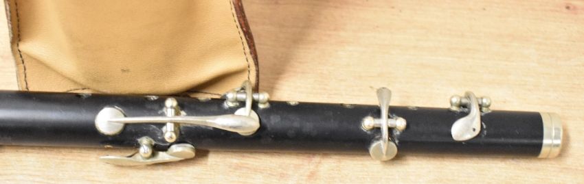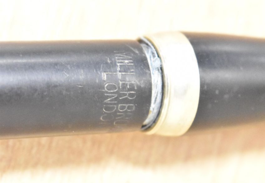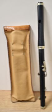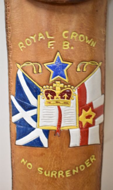 Vintage Marching Band Flute with makers mark for MILLER BROWNE of LONDON, two-piece black plastic, giving the appearance of African Blackwood, with five white metal/nickel silver finger keys, some damage seen and pitch unknown, contained within a leather press-stud fastening case emblazoned and embossed with ROYAL CROWN F.B. above the Scottish Saltire flag of St. Andrew, an open book with Queen's Crown thereon and the Northern Ireland Red Hand of Ulster Banner, all in vibrant colour, above the statement NO SURRENDER and RICKY.(1) A scarcely seen item.